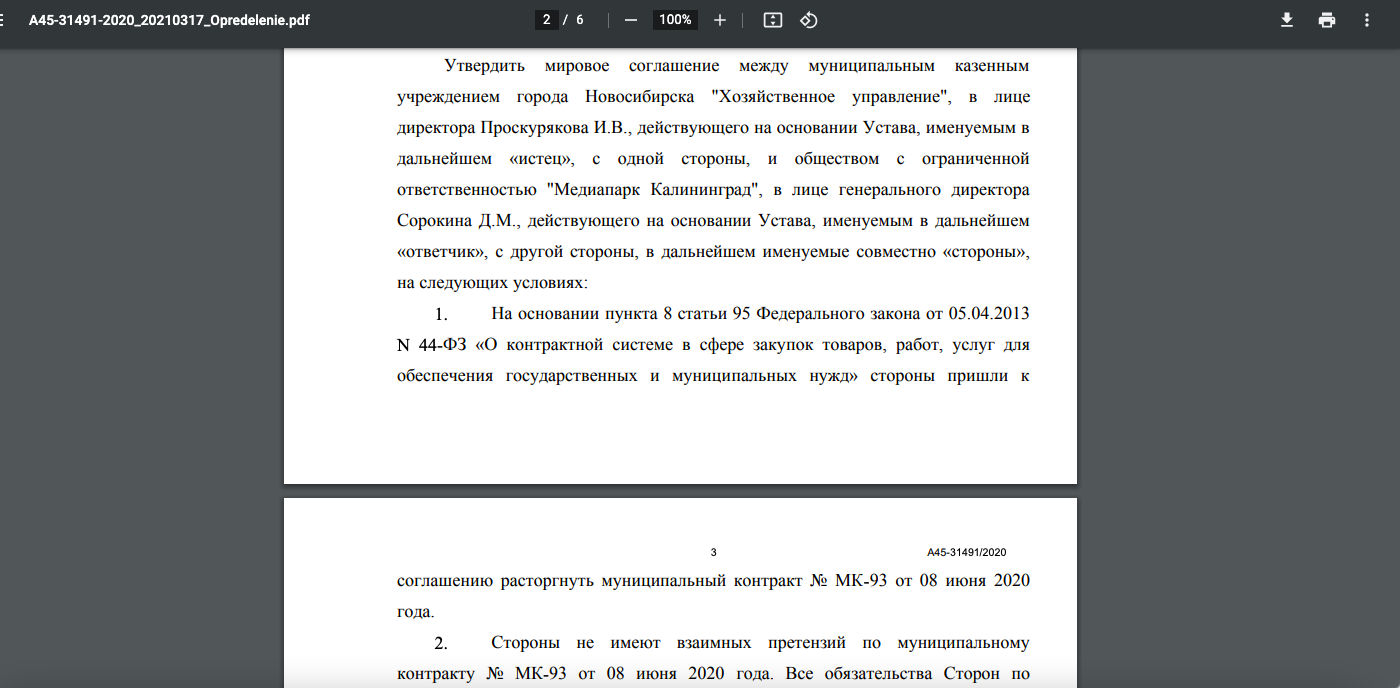 Муниципальное казенное учреждение города Новосибирска "Хозяйственное управление" обратилось в арбитражный суд с иском к обществу с ограниченной ответственностью "Медиапарк Калининград" о расторжении муниципального контракта, взыскании штрафа в размере 151063 руб. 34 коп.